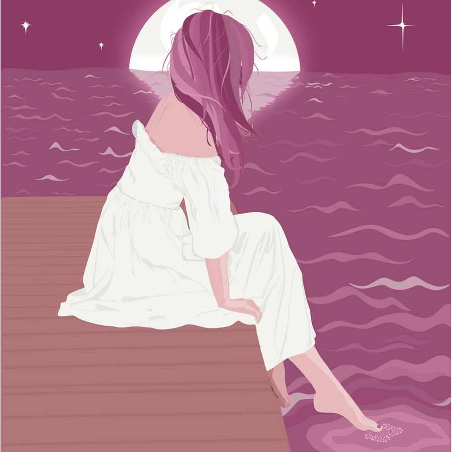 Find calm, clarity, and inner strength with the Silence of the Moon poster — a soulful spiritual poster designed to reconnect you with your inner power. Featuring a serene scene of a woman seated on a wooden pier, gazing at the moon rising from the tranquil sea, this mindfulness art print embodies the quiet strength found in stillness and self-reflection.